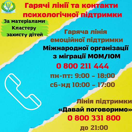 Центр психосоціальної підтримки НаУКМА та БО «Голоси дітей». Гаряча лінія для дітей (08.00 – 22.00(sad) 096 039 22 58; 099 198 57 95; 063 558 12 82.